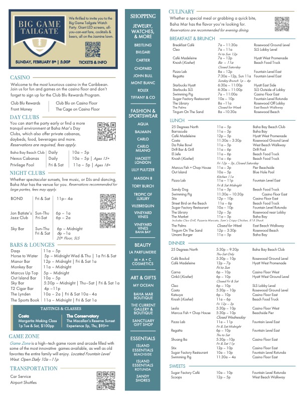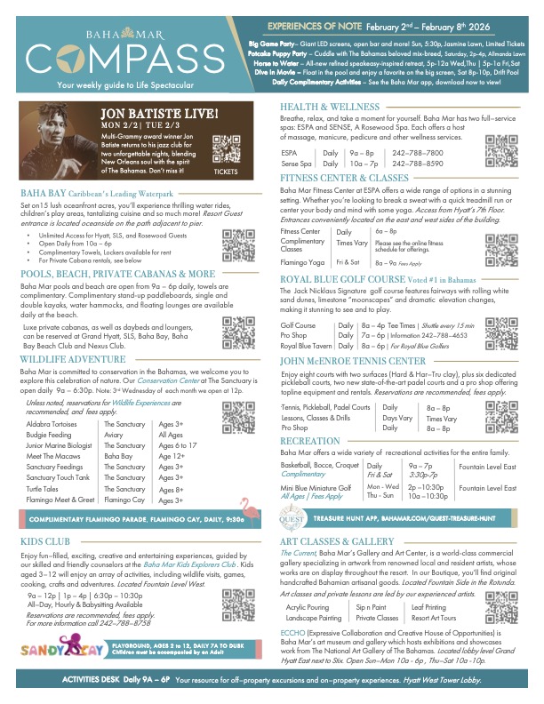 Baha Mar’s weekly activity guide, Compass, provides the most up to date information for the sweeping array of activities, amenities and experiences available during your stay at the resort.
